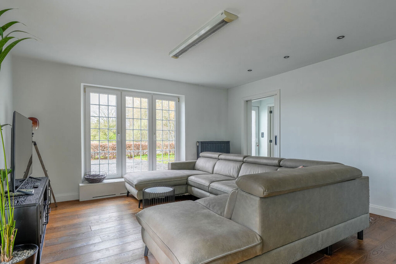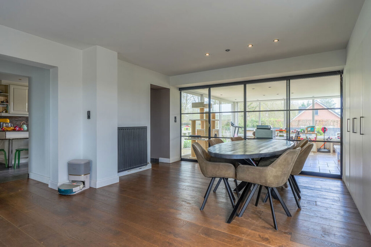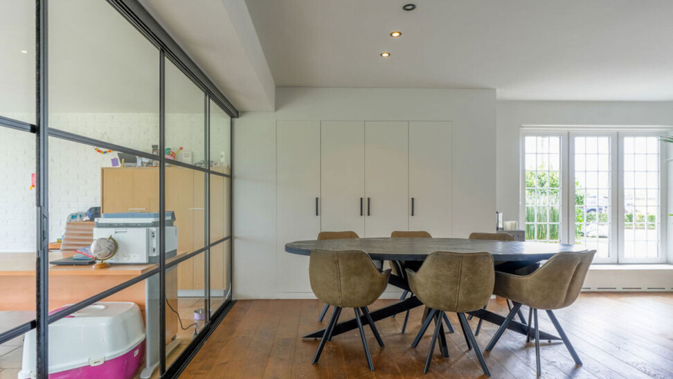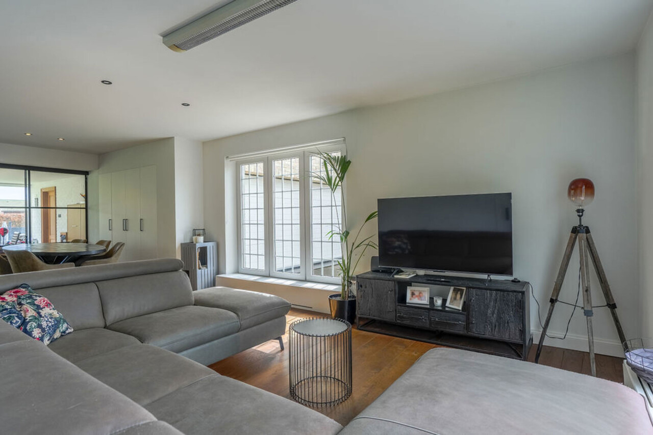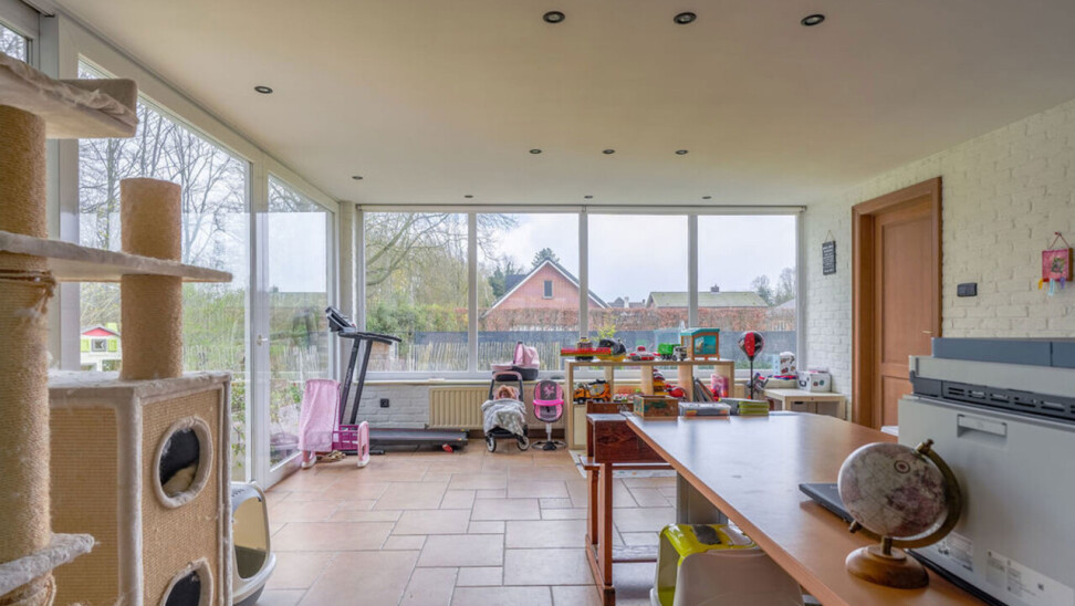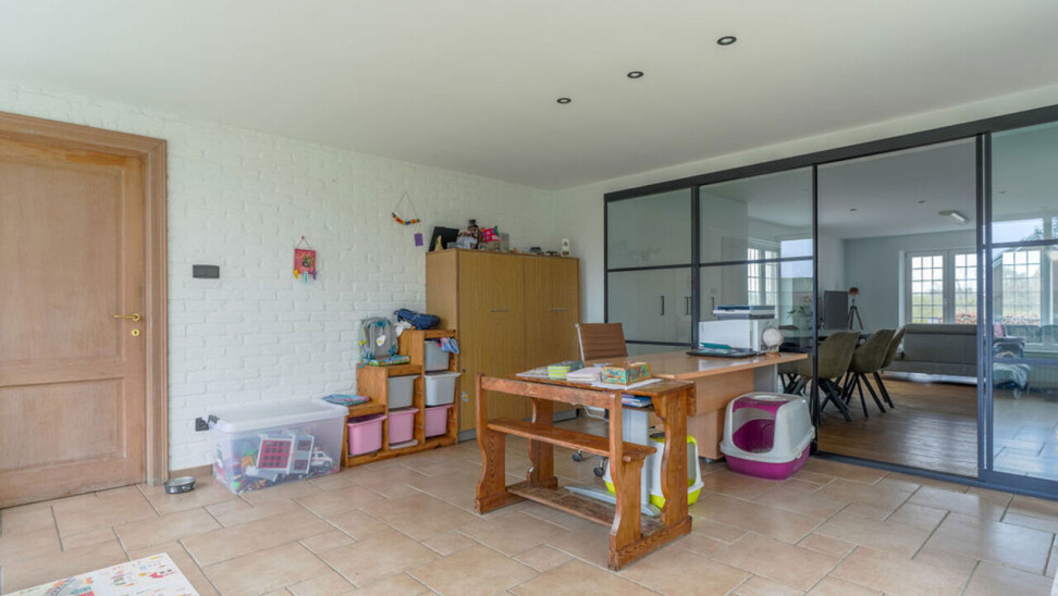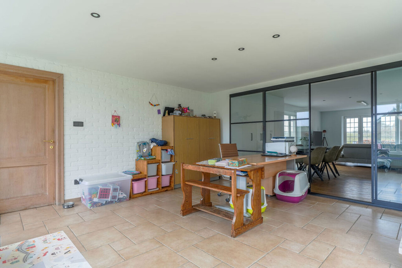 Bij binnenkomst via de voordeur komt u in de inkomhal. Meteen links bevindt zich een aparte kamer, ideaal in te richten als bureau, speelkamer of extra slaapkamer op het gelijkvloers. Vanuit de hal heeft u toegang tot de leefruimtes. De lichtrijke woonkamer is afgewerkt met een parketvloer en voorzien van inbouwkasten. Via de stijlvolle aluminium schuifpui in steellook bereikt u de sfeervolle veranda, een aangename plek om het hele jaar door te genieten.