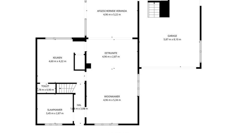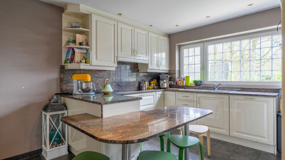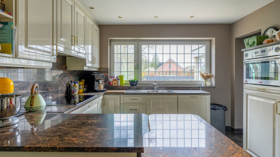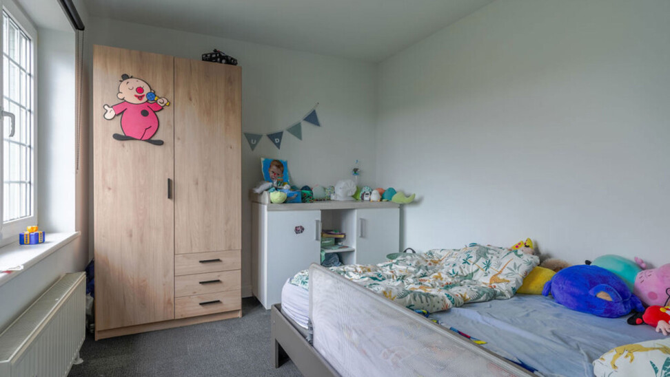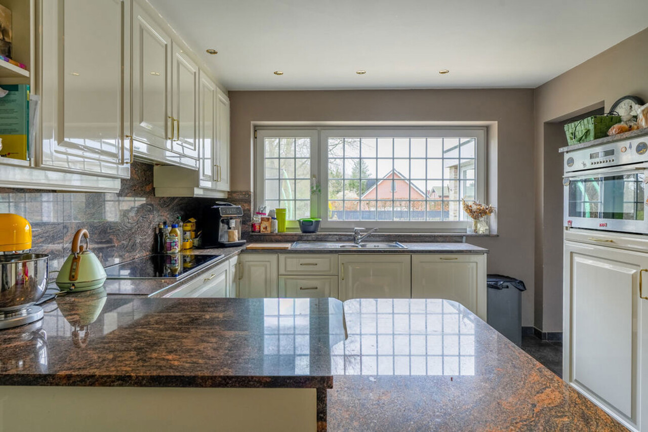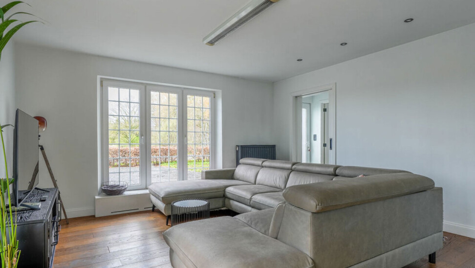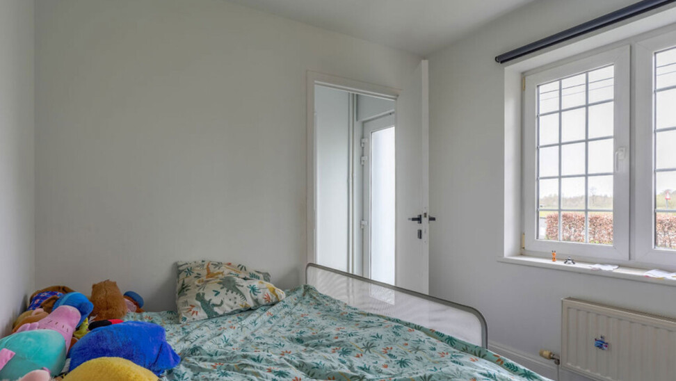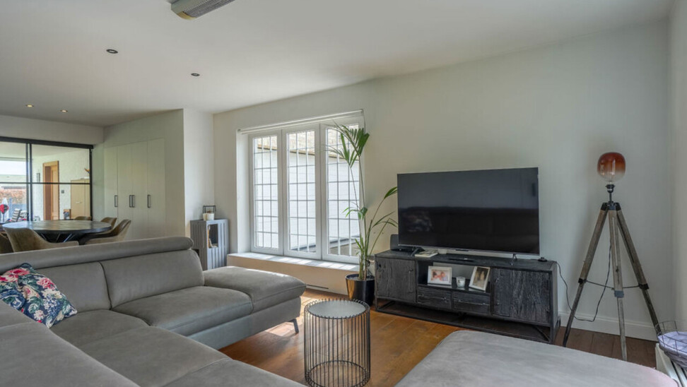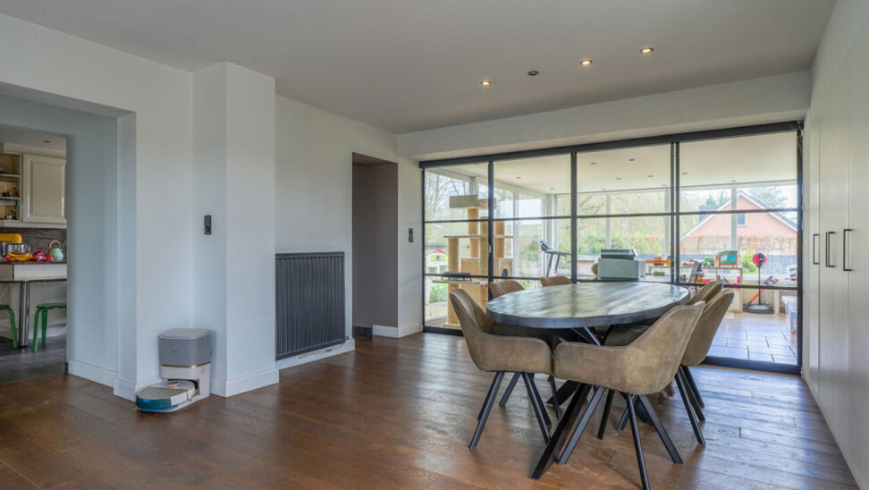 Bij binnenkomst via de voordeur komt u in de inkomhal. Meteen links bevindt zich een aparte kamer, ideaal in te richten als bureau, speelkamer of extra slaapkamer op het gelijkvloers. Vanuit de hal heeft u toegang tot de leefruimtes. De lichtrijke woonkamer is afgewerkt met een parketvloer en voorzien van inbouwkasten. Via de stijlvolle aluminium schuifpui in steellook bereikt u de sfeervolle veranda, een aangename plek om het hele jaar door te genieten.