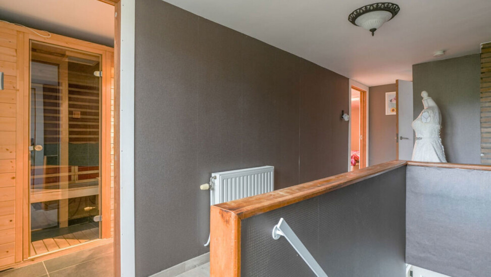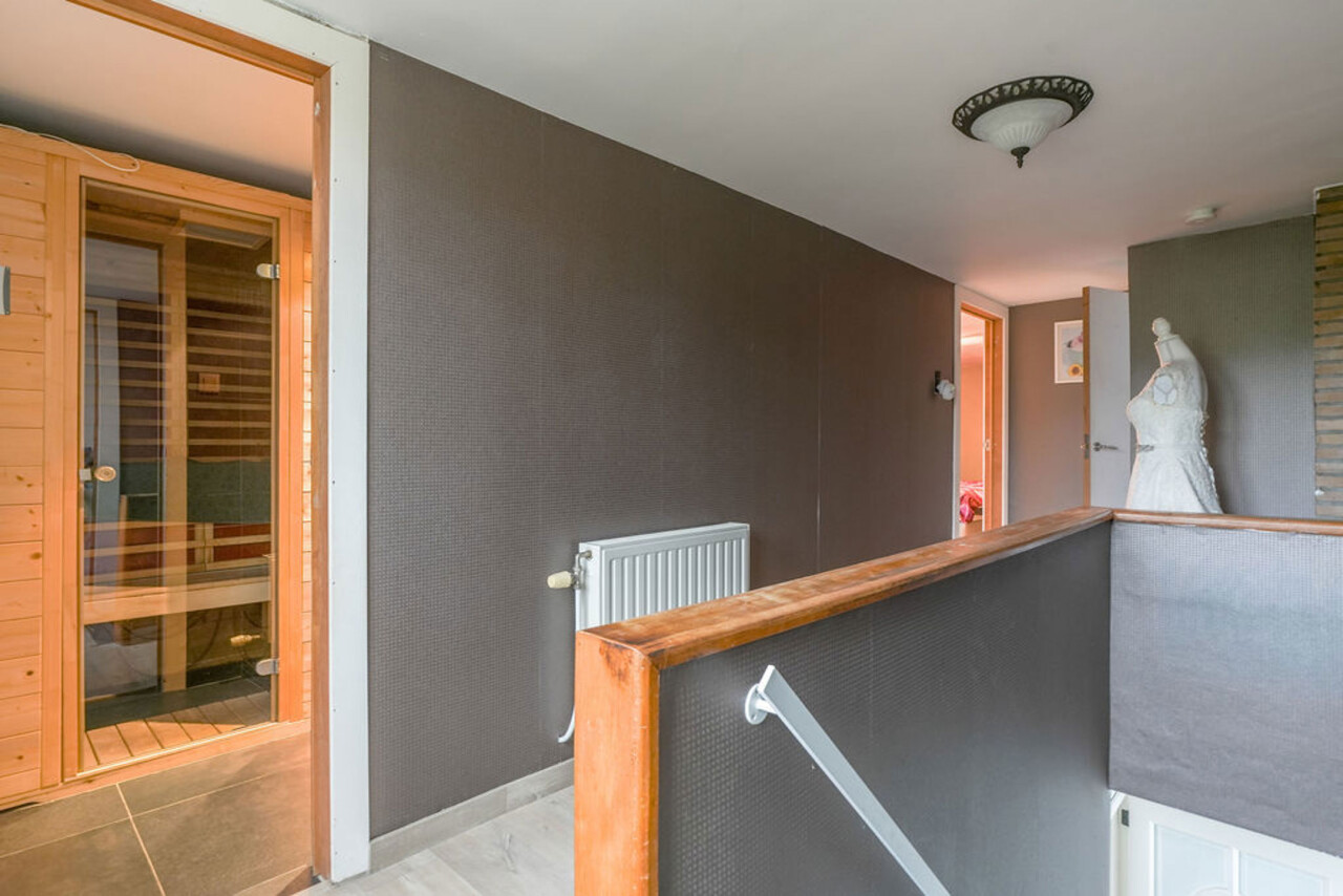 Op de bovenverdieping geeft de overloop toegang tot drie slaapkamers, waarvan één is voorzien van inbouwkasten en alle kamers zijn afgewerkt met laminaat. De badkamer is ingericht met een sauna, dubbele wastafel, een douche in bad en een toilet.